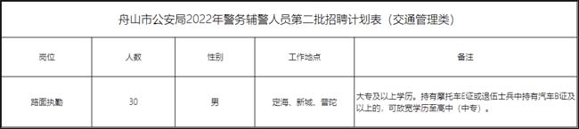 計(jì)劃招聘30名男性警務(wù)輔助人員,具體崗位、招聘人數(shù)、資格條件詳見(jiàn)《舟山市公安局2022年交通管理類警務(wù)輔助人員第二批招聘計(jì)劃表》。