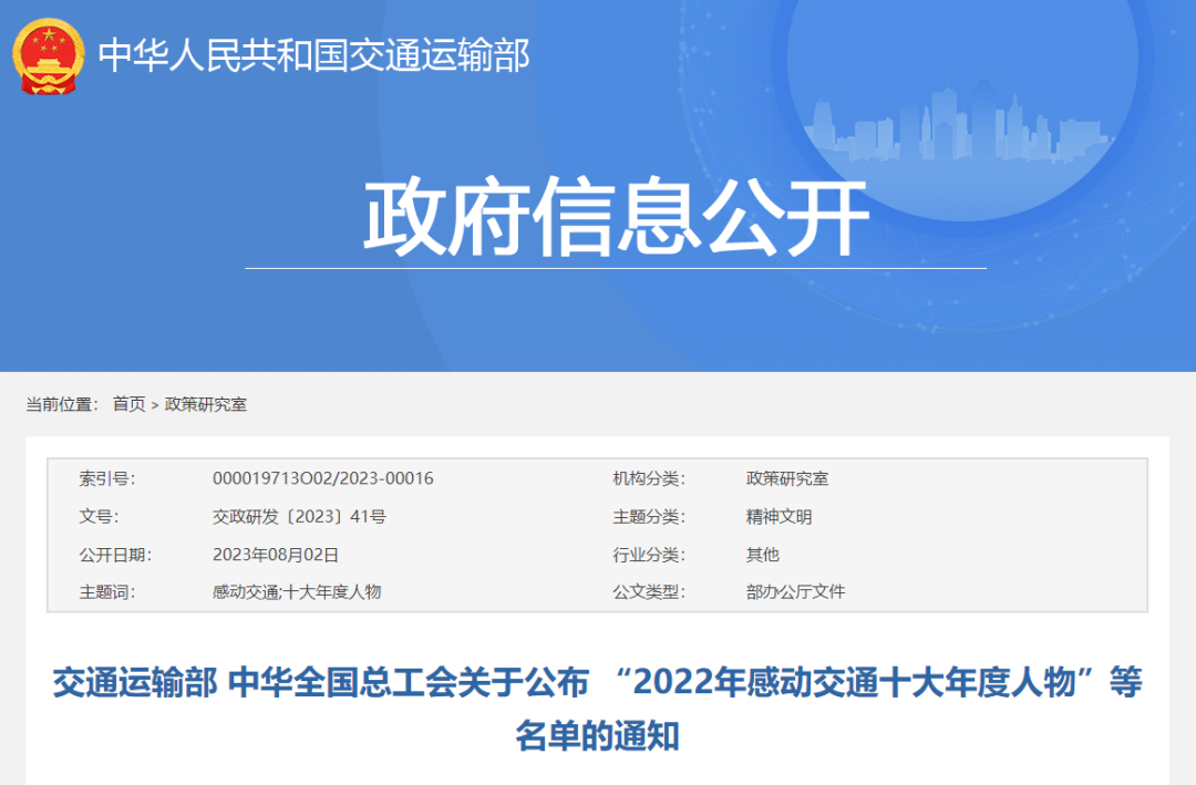2022年11月,交通運(yùn)輸部、中華全國(guó)總工會(huì)組織開展了“2022年感動(dòng)交通年度人物”推選宣傳活動(dòng)。