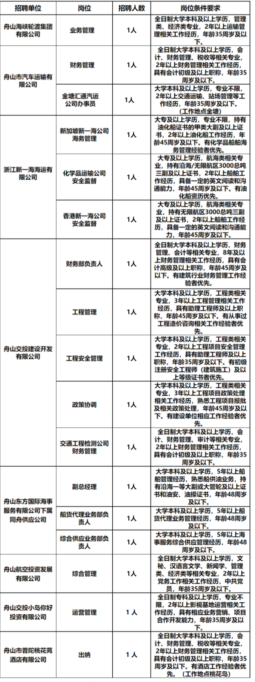 舟山交通投資集團(tuán)有限公司是舟山市政府直屬?lài)?guó)有獨(dú)資企業(yè),主要從事交通基建、港航物流、客運(yùn)旅游、國(guó)際貿(mào)易、工程檢測(cè)、海事服務(wù)等業(yè)務(wù),因工作需要,向社會(huì)公開(kāi)招聘集團(tuán)及所屬企業(yè)相關(guān)工作人員。現(xiàn)將有關(guān)招聘事項(xiàng)公告如下: