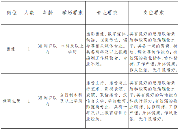 舟山傳媒發(fā)展有限公司是舟山傳媒集團(tuán)下屬公司之一。因事業(yè)發(fā)展需要,面向社會(huì)公開招聘2名工作人員,現(xiàn)將有關(guān)事項(xiàng)公告如下: