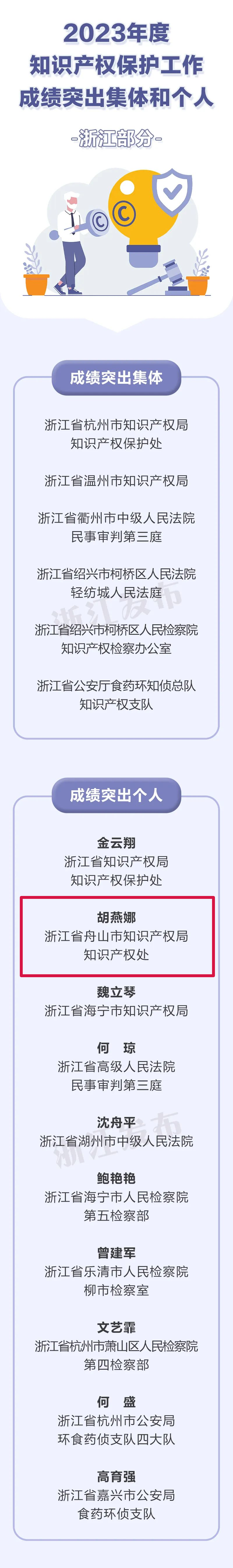 近日,國(guó)家知識(shí)產(chǎn)權(quán)局、最高人民法院、最高人民檢察院、公安部印發(fā)《關(guān)于對(duì)2023年度知識(shí)產(chǎn)權(quán)保護(hù)工作成績(jī)突出集體和個(gè)人給予表?yè)P(yáng)的通報(bào)》,對(duì)2023年度全國(guó)知識(shí)產(chǎn)權(quán)保護(hù)工作成績(jī)突出的100個(gè)集體和200名個(gè)人予以通報(bào)表?yè)P(yáng)。