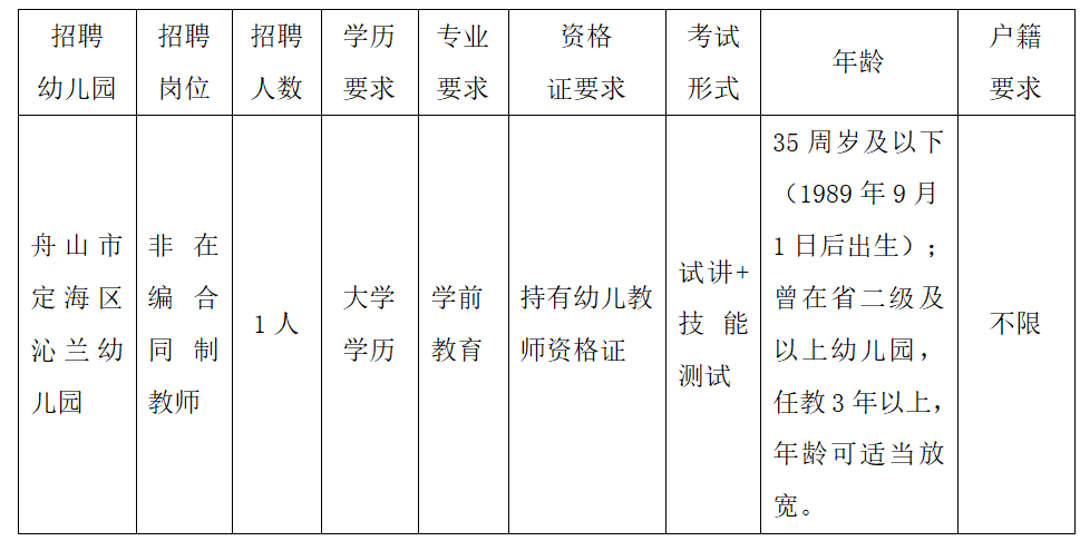 - 根據(jù)《舟山市定海區(qū)教育局關(guān)于印發(fā)<幼兒園勞動(dòng)合同制教職工管理暫行辦法>的通知》(定教人〔2023〕39號(hào))要求,經(jīng)定海區(qū)教育局同意,結(jié)合幼兒園實(shí)際,舟山市定海區(qū)沁蘭幼兒園決定面向社會(huì)公開招聘非在編合同制幼兒教師1名,現(xiàn)將有關(guān)事項(xiàng)公告如下:
