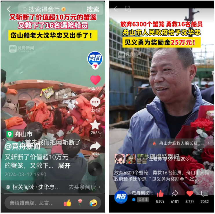 2021年9月和2024年3月,沈華忠在海上作業(yè)時(shí)兩次碰到遇險(xiǎn)船只沉沒、船員落海的情況。危急時(shí)刻,沈華忠均沒有絲毫猶豫,主動(dòng)放棄生產(chǎn)作業(yè),斬?cái)嘈坊\連接繩,舍棄價(jià)值幾十萬元的蟹籠和漁獲,第一時(shí)間駕船前往事發(fā)海域?qū)嵤┚仍瑑纱喂簿绕?2名落水船員。