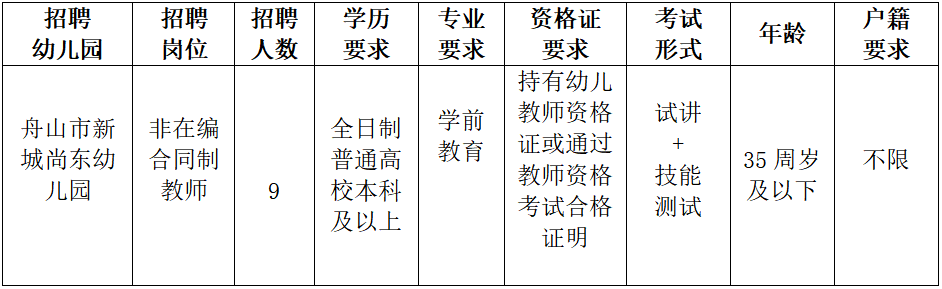 根據(jù)舟教人〔2022〕11號(hào)文件《舟山市本級(jí)改革創(chuàng)新公辦幼兒園辦園體制實(shí)施方案》要求,經(jīng)舟山市教育局同意,結(jié)合幼兒園實(shí)際需要,舟山市新城尚東幼兒園決定面向社會(huì)公開(kāi)招聘非在編合同制教師9名,現(xiàn)將有關(guān)事項(xiàng)公告如下: