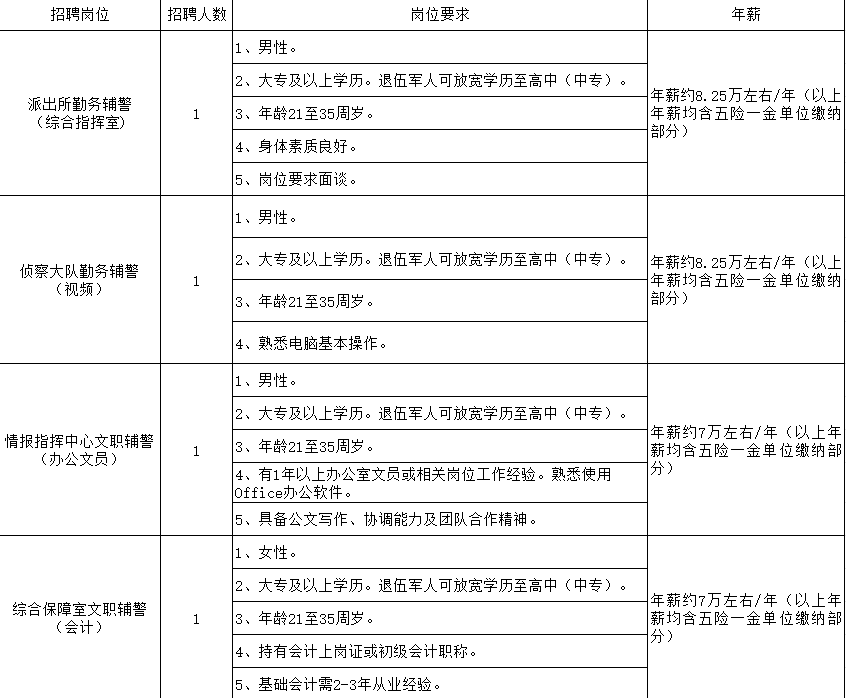 警務(wù)輔助人員年薪參考上述表格。對錄用擬聘用人員簽訂聘用合同,實行合同管理。年薪均包含五險一金單位繳納部分。報名聯(lián)系方式