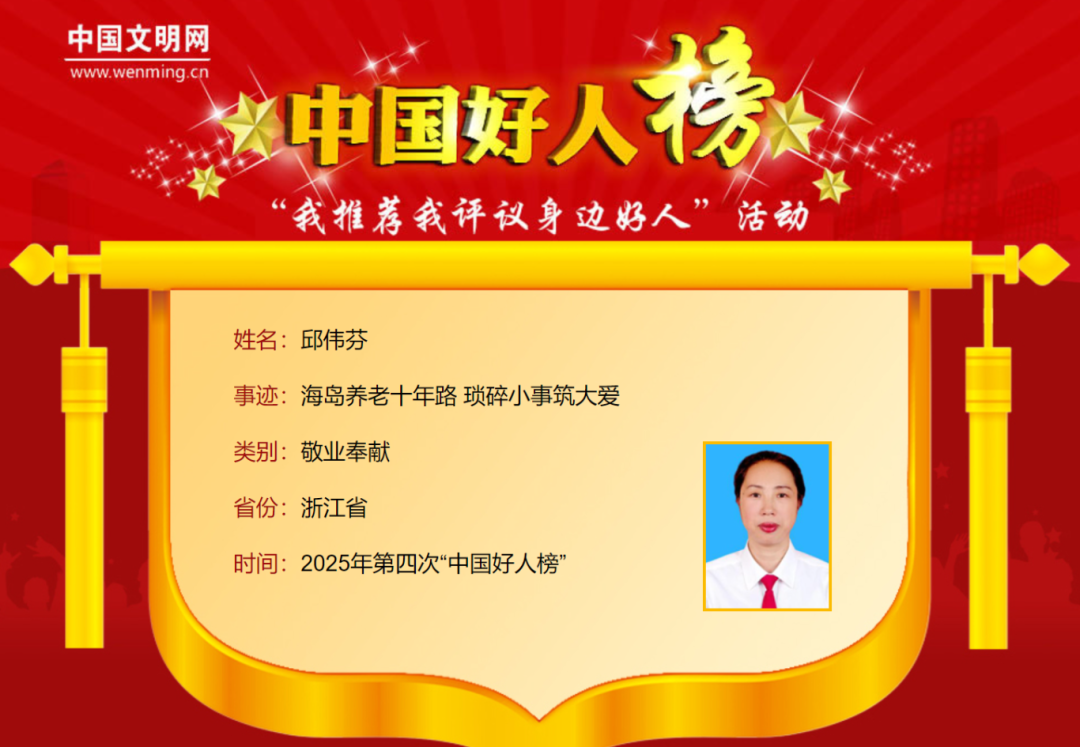 長涂島上,老年人口占了總人口的一半以上,交通不便、資源有限,養(yǎng)老工作任重道遠。邱偉芬主動協調鎮(zhèn)村資源,為困難家庭爭取補助;動員鄰居互助,為獨居老人送餐送服務。面對贊譽,她總說:“我做的都是小事?!钡沁@些“小事”,讓孤寡老人有了依靠,讓殘疾人重燃希望,讓偏僻海島流淌著溫情。她也因此先后獲評“浙江好人”、第十屆舟山市道德模范。